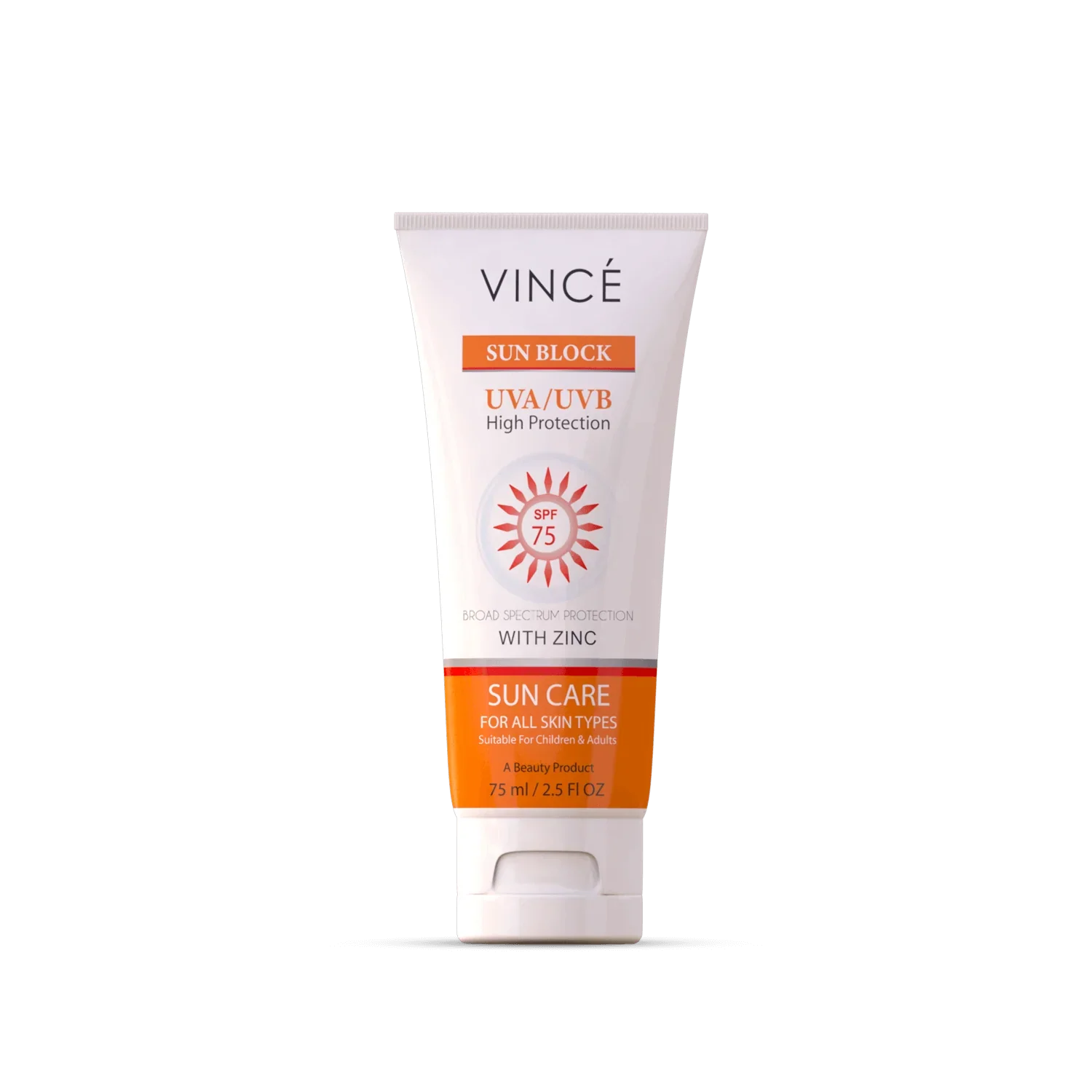 The lightweight-soft texture of Vince Sunblock combines anti-UVB filters with Titanium dioxide. Titanium dioxide works as a UV filtering ingredient in sunblocks it helps protect a person's skin by blocking the absorption of the sun’s ultraviolet light that can cause sunburn. A higher SPF blocks out more rays & Offers slightly more protection. Vince Sunblock SPF 75 offers superior broad-spectrum protection from aging UVA rays and burning UVB rays than comparable products with lower SPF values. It goes on easily and absorbs quickly for an invisible, lightweight feel on your skin. Vince Sunblock SPF 75 is the latest scientifically developed moisturizing oil-free lotion that helps protect the skin against UVA and UVB rays, and also helps to prevent the formation of dark spots and discoloration.